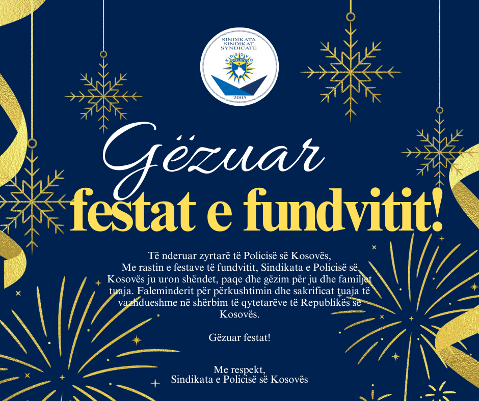 Me rastin e festave të fundvitit, Sindikata e Policisë së Kosovës ju uron shëndet, paqe dhe gëzim për ju dhe familjet tuaja. Faleminderit për përkushtimin dhe sakrificat tuaja të vazhdueshme në shërbim të qytetarëve të Republikës së Kosovës.