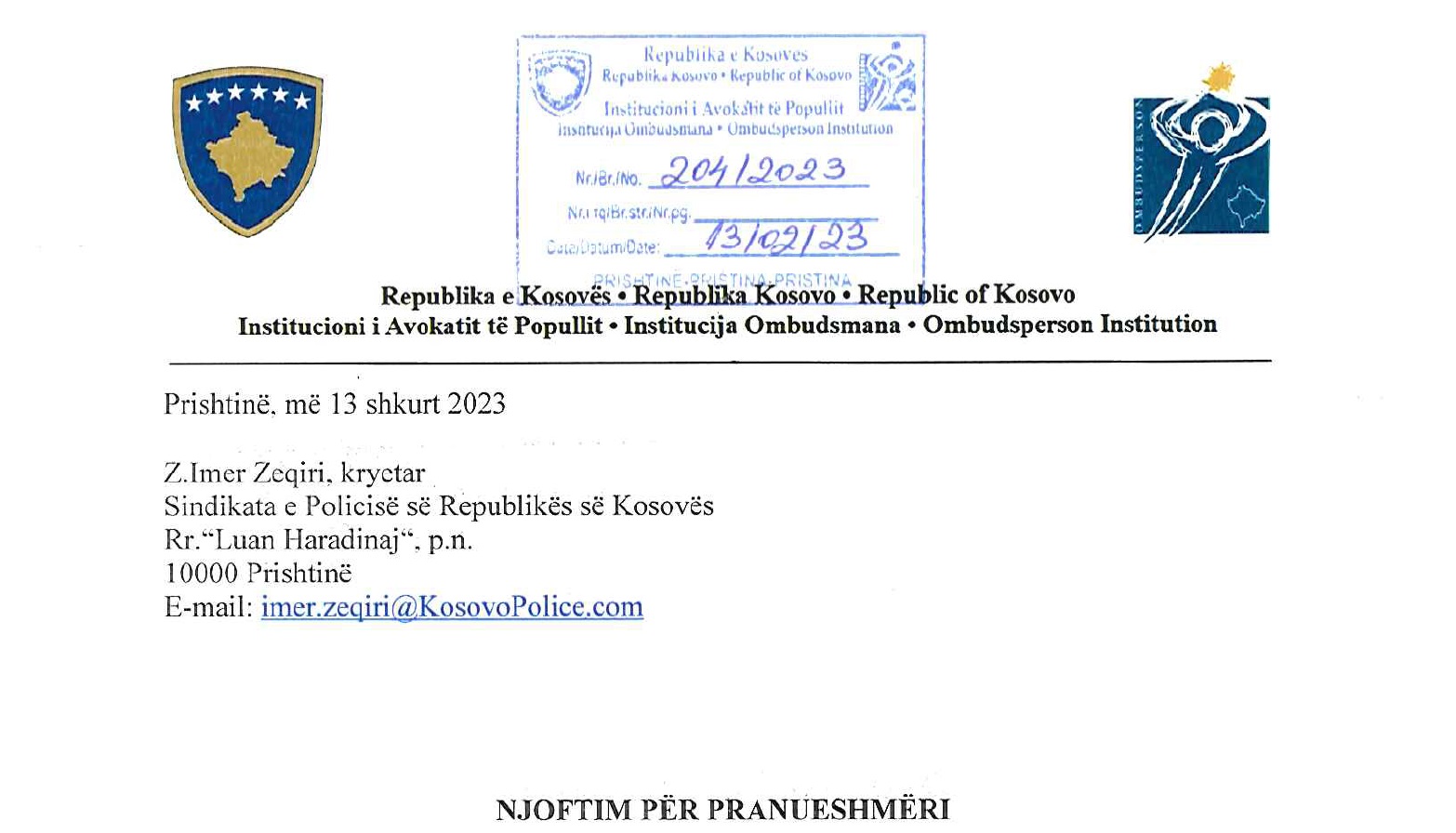 Sindikata e Policisë së Kosovës me datë 03.02.2023 ka dërguar Kërkesës për inicim të vlerësimit të kushtetutshmërisë së Ligjit nr. 08/L – 196 për pagat në Sektorin Publik tek Avokati I Popullit lidhur me shqetësimet për Ligjin e Pagave, përkatësisht: Neni 26 Shtesat për kushte specifike të punës (shtesat e rrezikshmërisë), Nenin 35 dhe 36 Kompensimet, kompensimi për kujdestari, punën gjatë natës dhe jashtë orarit të punës, Neni 44 Shtojcat e Ligjit, Shtojca Nr.5.1 – Policia e Kosovës dhe Shtojca nr, 10.6 e Projektligjit – nëpunësit e shërbimit civil, nëpunësi i administratës së shërbimit publik dhe nëpunësi teknik dhe mbështetës.