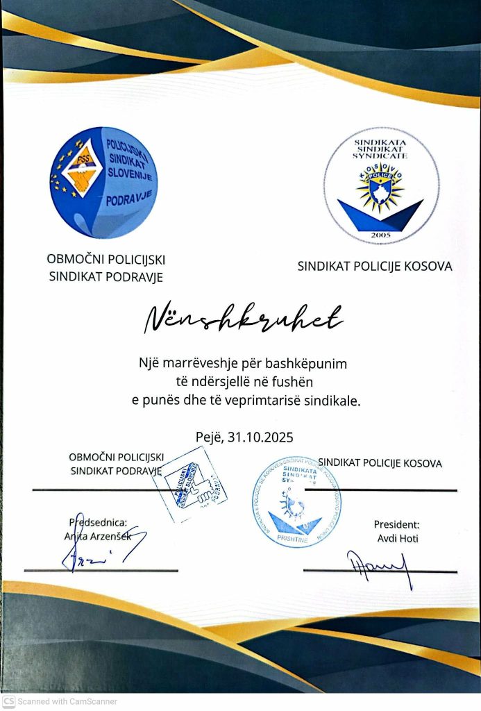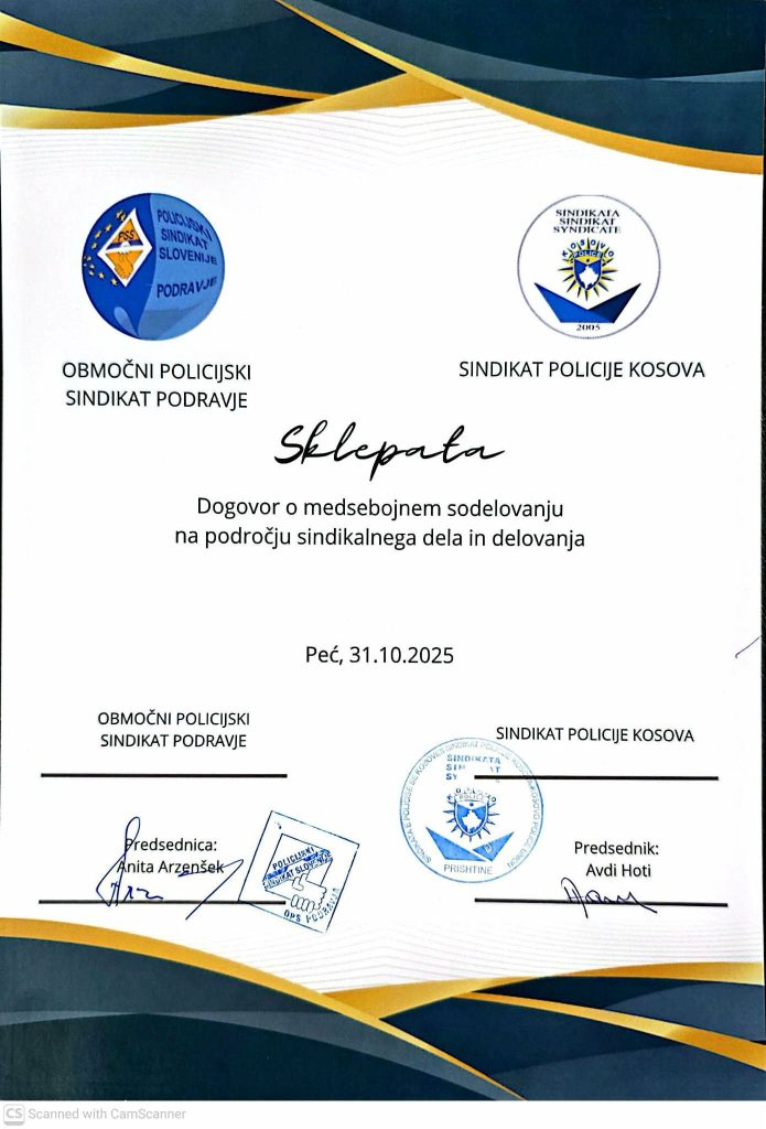 Si rezultat i përkushtimit të përbashkët për avancimin e të drejtave, dinjitetit dhe profesionalizmit të punonjësve të policisë, u nënshkrua Marrëveshja e Bashkëpunimit Ndërkombëtar ndërmjet Sindikatës së Policisë së Kosovës (SPK) dhe Sindikatës së Policisë së Sllovenisë – OPS Podravje. Kjo marrëveshje shënon një moment të rëndësishëm historik për fortësimin e lidhjeve sindikale dhe zhvillimin e kapaciteteve profesionale në nivel ndërkombëtar.